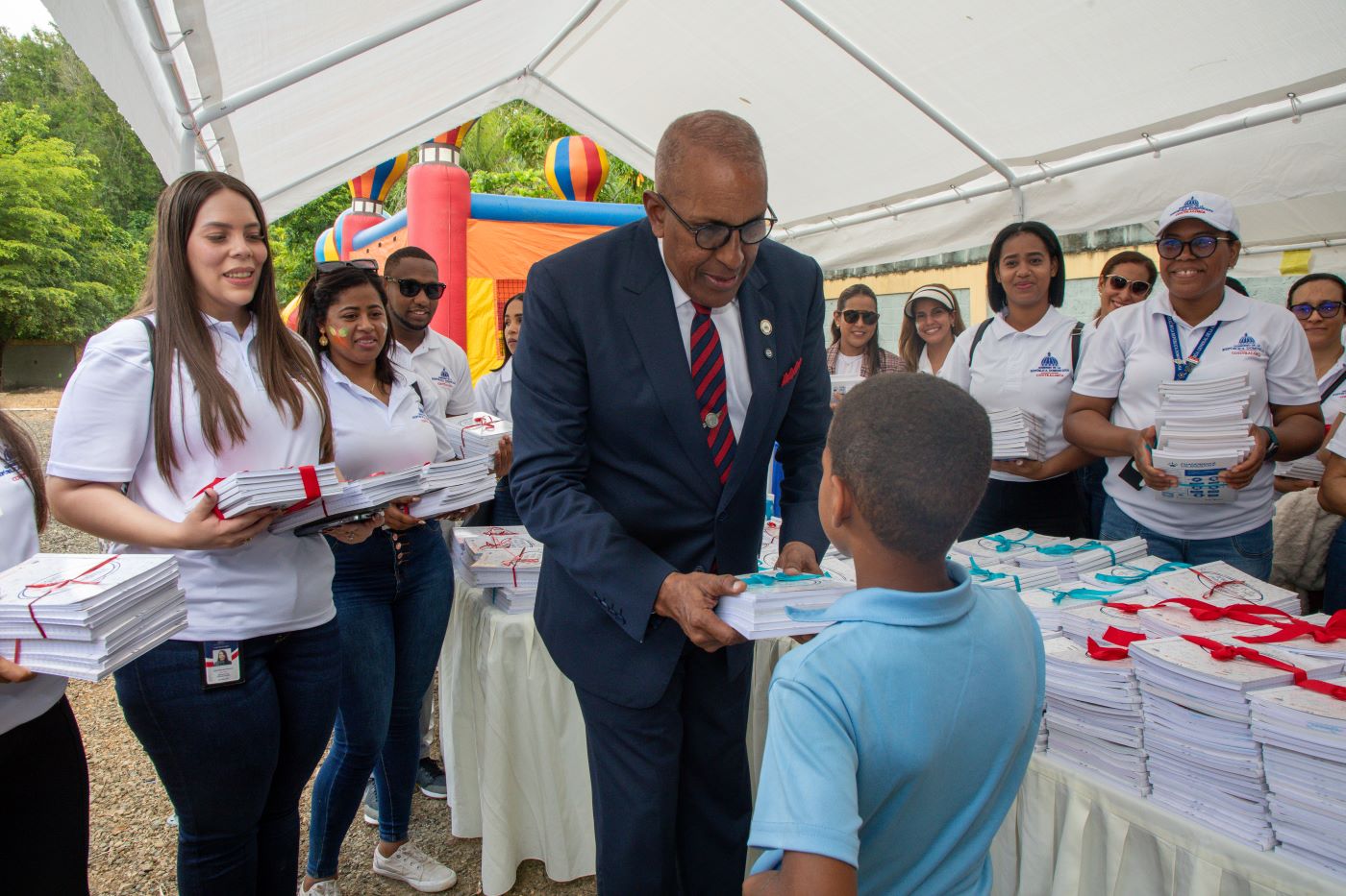 La Contraloría General de la República (CGR), encabezada por su titular Félix Santana García, realizó una entrega de cuadernos reciclados a niños y niñas de la escuela Agustín Herrera Rodríguez, en la comunidad El Platanal, provincia Sánchez Ramírez, como parte de su programa de Sostenibilidad y Responsabilidad Social.